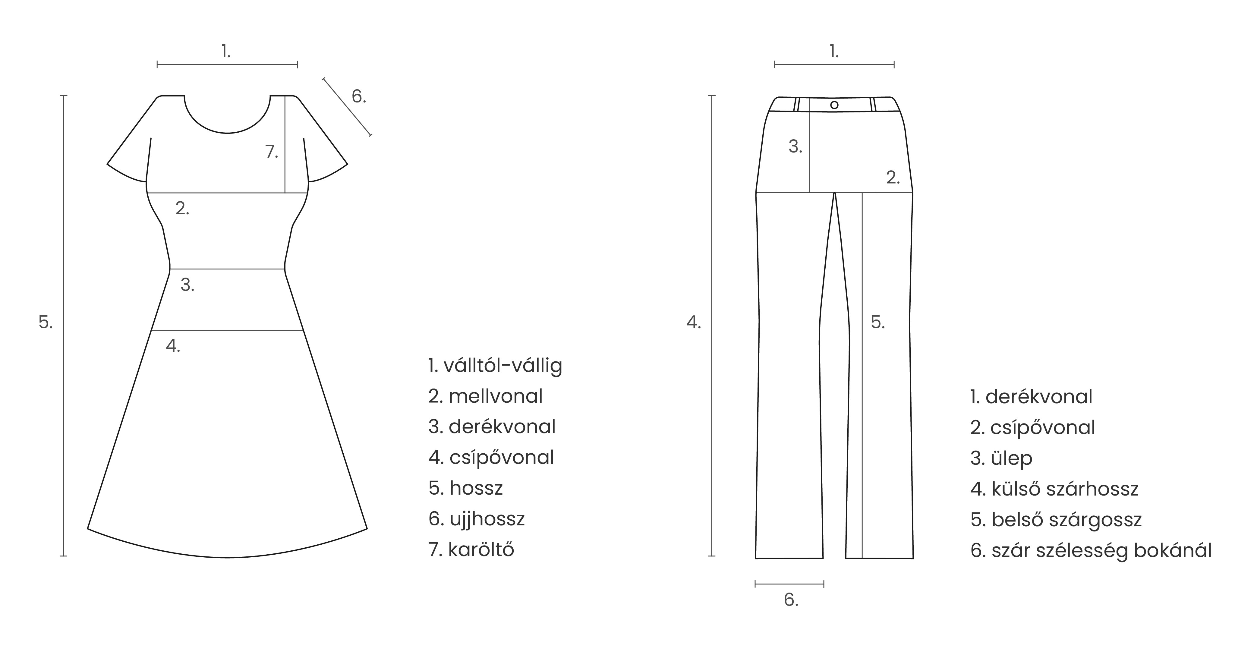 - A pontosság miatt, a ruhákat az ábrán látható módon kiterítve lecentizzük, és ezeket az adatokat a termékek leírásánál feltüntetjük. Kerületben a mért adatok duplája értendő.